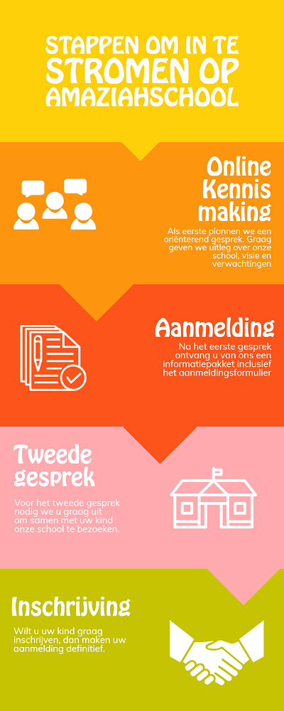 Amaziah School staat open voor geïnteresseerde leerlingen. De toelatingsprocedure bestaat uit een online kennismaking via zoom en een kennismakingsbezoek op school. Daarnaast krijgt uw kind een diagnostische toets. Deze duurt ongeveer drie dagen en geeft een goed beeld welk niveau uw kind op dit moment heeft. Aan de hand van dit onderzoek en de gesprekken bekijken we samen of de school past bij het kind en wij uw kind kunnen bieden wat het nodig heeft.